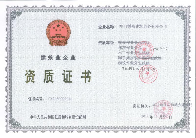 海口樹(shù)泉建筑勞務(wù)有限公司成立于2011年,公司位于???,其前身是一家專業(yè)建筑施工隊(duì),自2004年即開(kāi)始在海南從事建筑勞務(wù)施工。自成立至今,公司已經(jīng)擁有一支科學(xué)管理、質(zhì)量過(guò)硬、能打硬仗,搶工期的專業(yè)隊(duì)伍。能獨(dú)立承擔(dān)大中型工業(yè)與民用建筑 、室內(nèi)外裝修、各類機(jī)電設(shè)備安裝工程。代表工程有??跒I海華庭、三亞時(shí)代海岸T01/02/04/05棟高層、合肥東?;▓@二期、陵水富力灣B區(qū)高層、三亞金中海(酒店)、瓊海大印經(jīng)典花園、海口環(huán)球海景大酒店(四星級(jí)酒店,在建中)、陵水珍珠大廈(五星酒店)、海口萬(wàn)達(dá)廣場(chǎng)、美蘭機(jī)場(chǎng)二期。